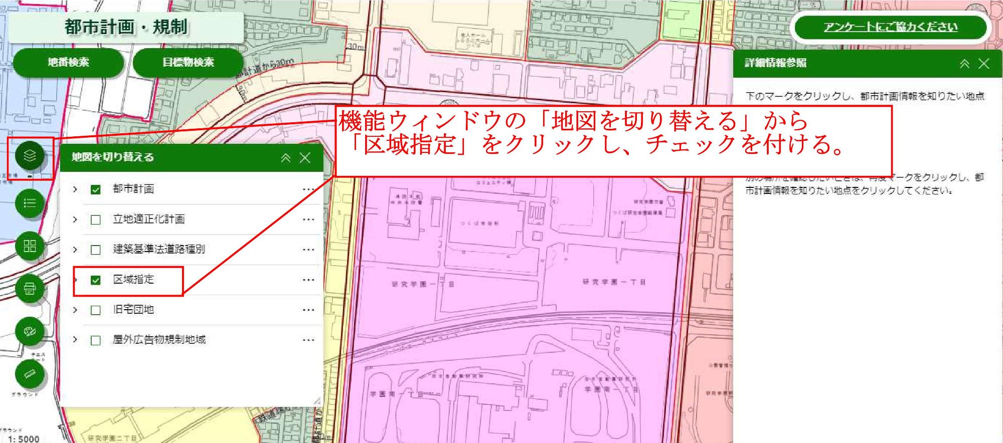 地図が表示されたら、機能ウィンドウの「地図を切り替える」機能から「区域指定」をクリックしチェックを入れる