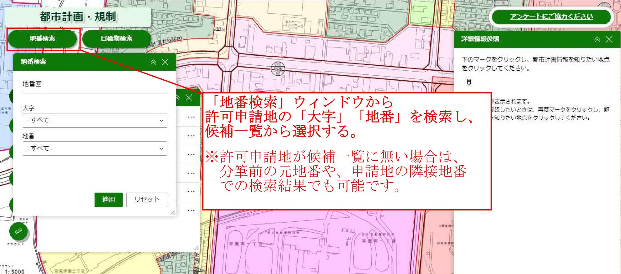 地番検索ウィンドウから、許可等申請地の「大字」「地番」を検索し、候補一覧から選択する