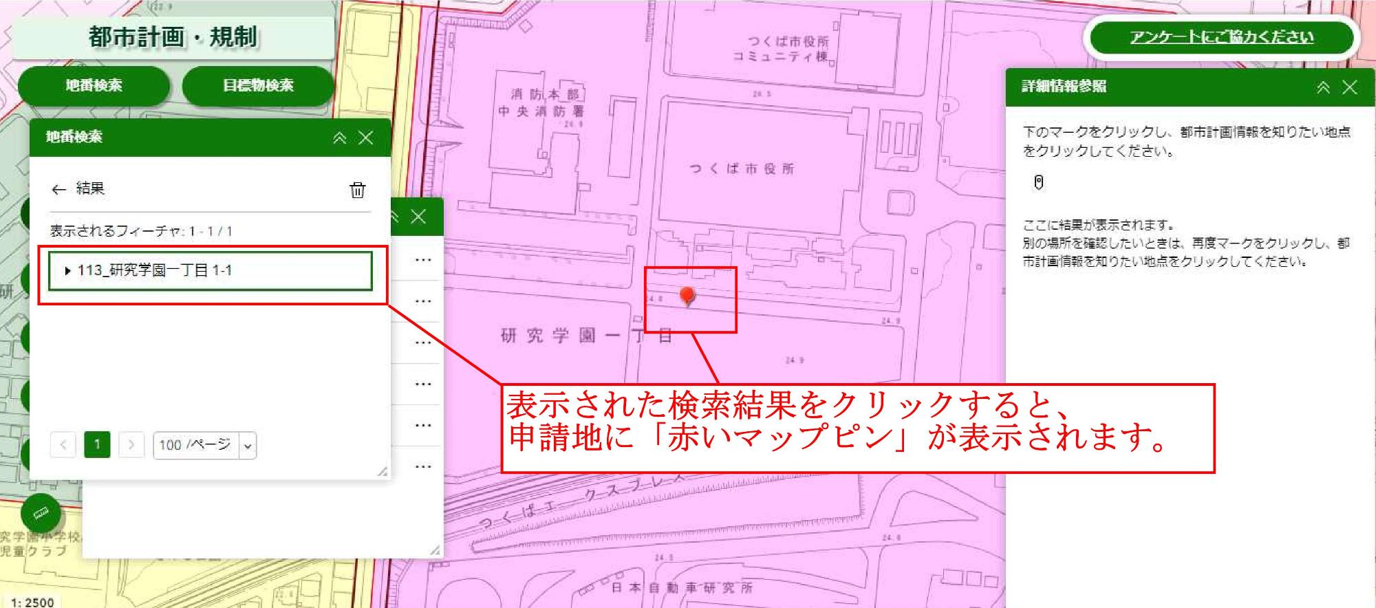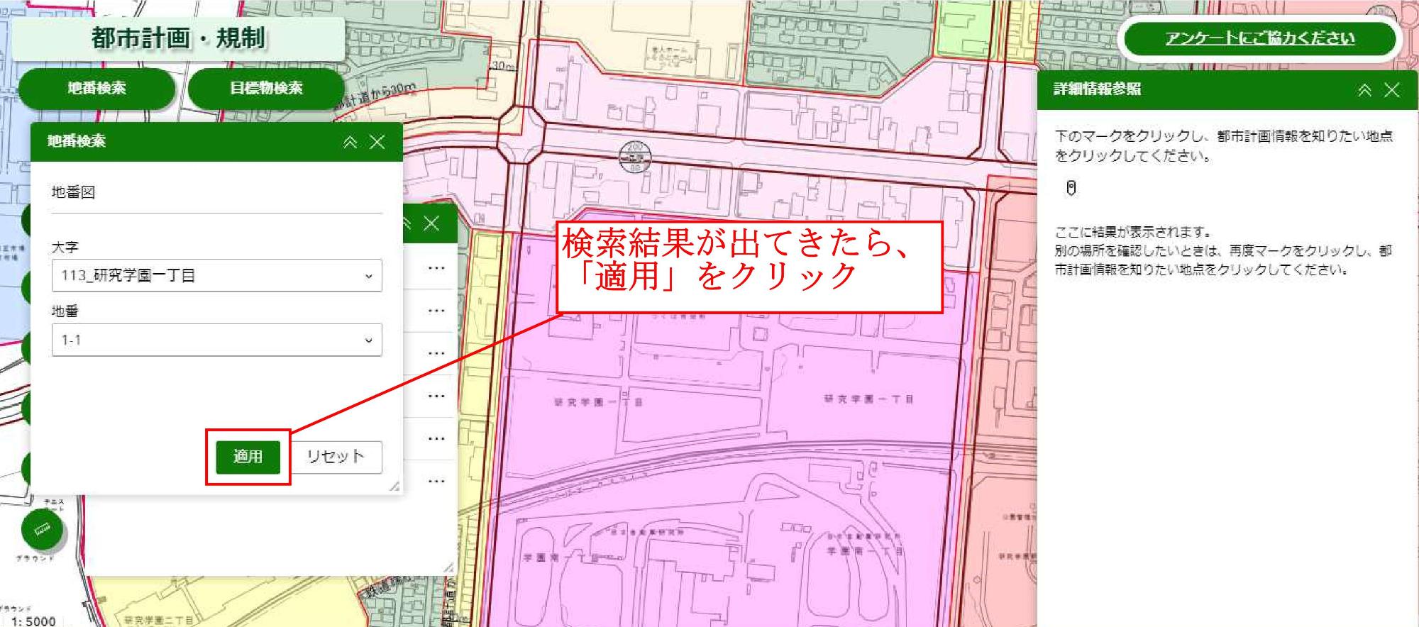 検索結果を選択した後に「適用」をクリックし、表示された検索結果をクリックすると申請地に赤いマップピンが表示されますのでご確認ください