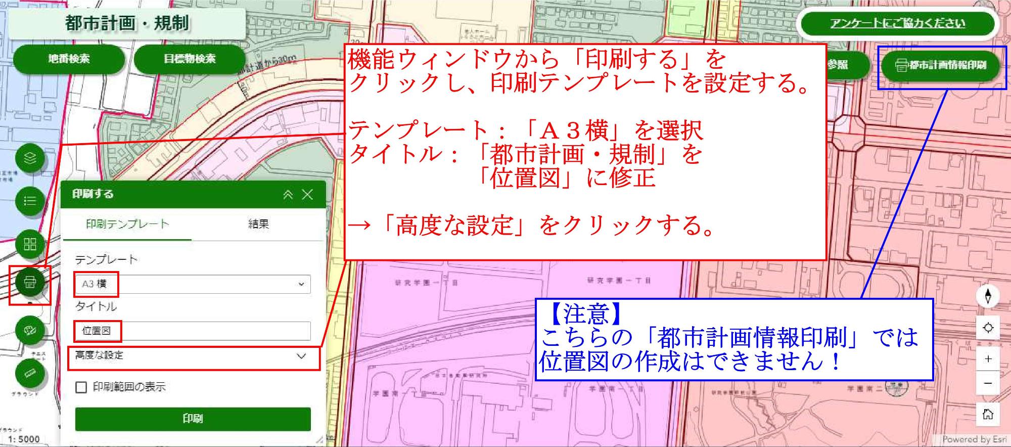 画面右上にある「都市計画情報印刷」からは、許可等申請書に添付するための「位置図」は作成できません。ご注意ください。