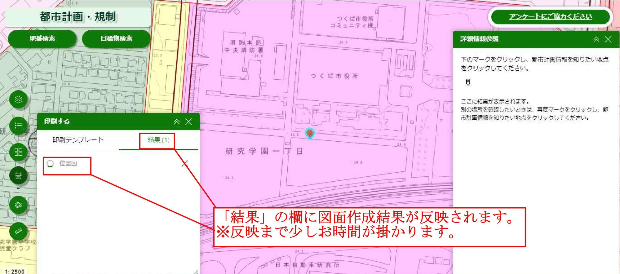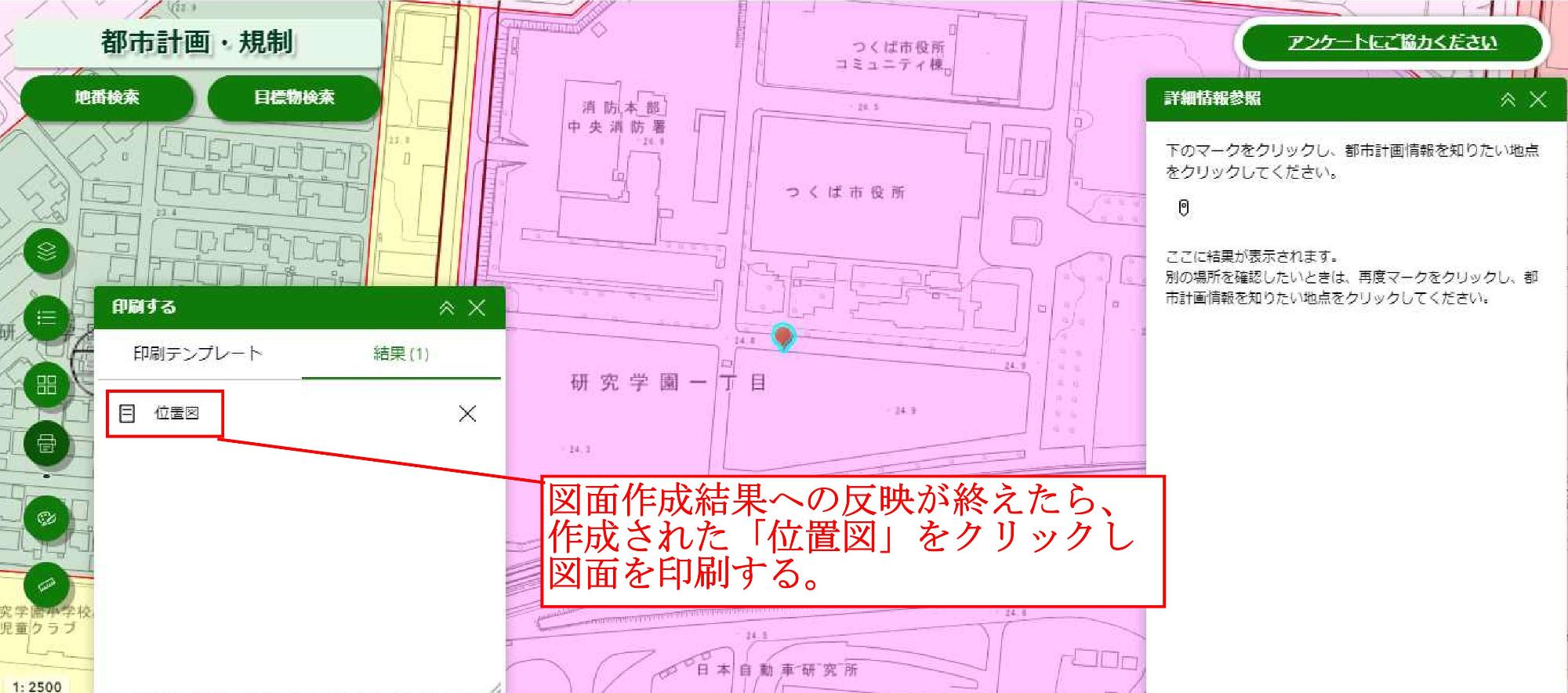 次に、つくミルを使って「位置図」を作成・印刷する手順を以下にお示しします。こちらで作成・印刷された「位置図」は、つくば市開発指導課へ提出されるすべての申請(開発許可申請、建築許可申請、60条証明申請含む)に添付することができます。