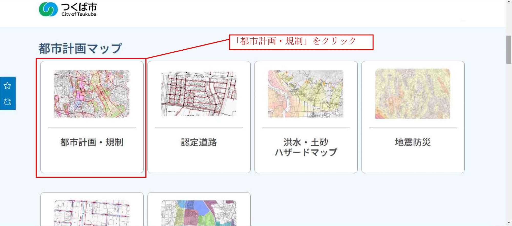 「つくミル」を開き、「都市計画マップ」から「都市計画・規制」をクリックする