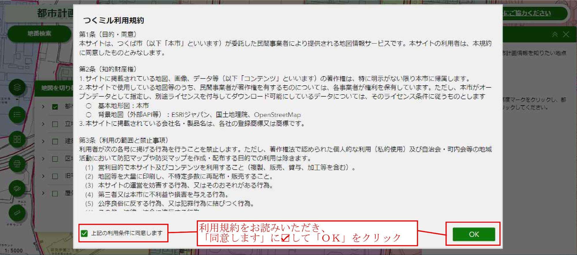 利用規約をお読みいただき、「同意します」にチェックを入れてから「OK」をクリックする