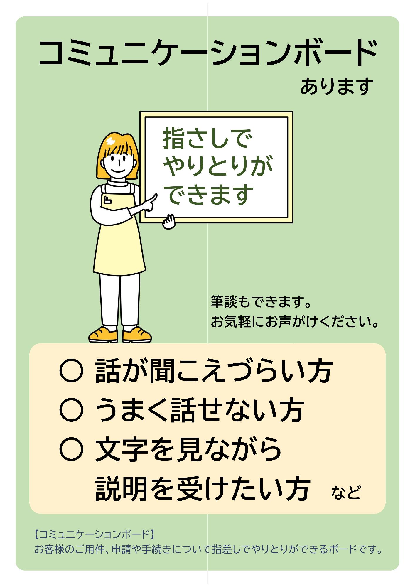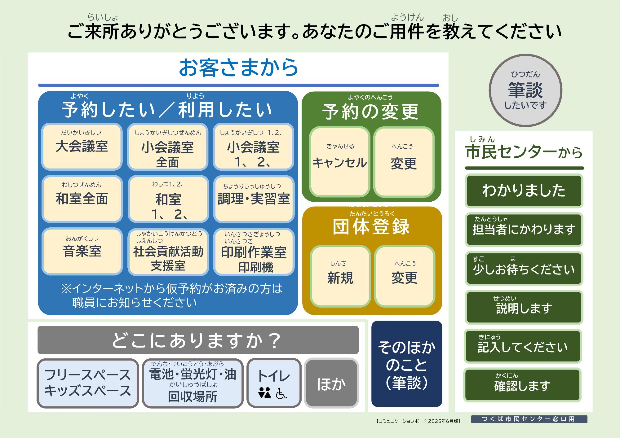 ※つくば市民センター受付には、話し言葉による会話が困難な方の支援ツールとして、「コミュニケーションボード」を設置しています。ぜひご活用ください。