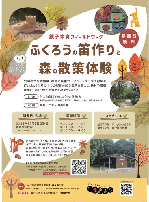 高崎自然の森でふくろうの笛の製作ワークショップとプチ散策を行います!自然の中での製作体験や散策を通して、森林や環境保全について親子で考えてみませんか?