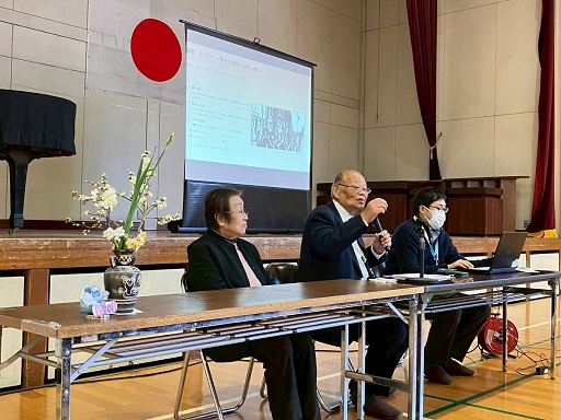 5・6年生の児童とその保護者を対象に、授業参観の一環として実施したもので、児童たちは、語り部の話を興味深く聞いている様子でした。
