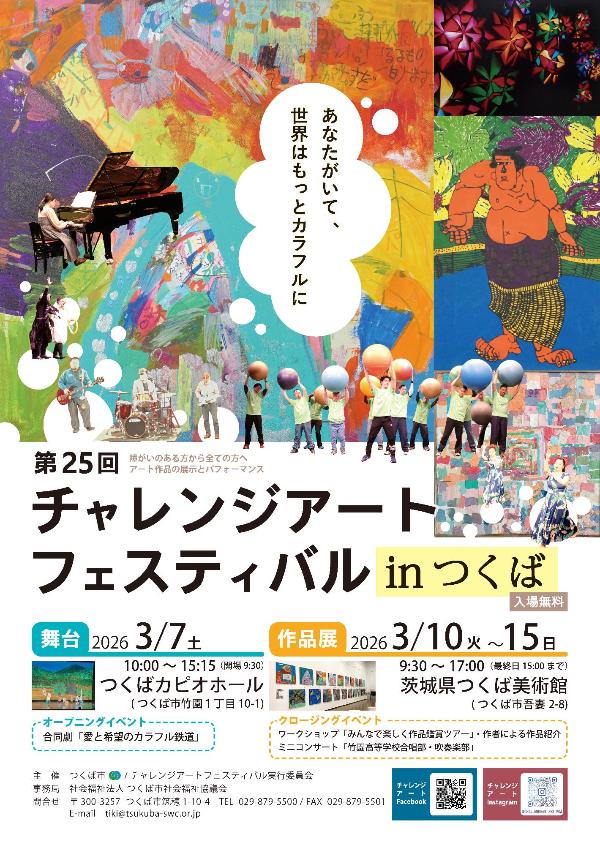 「チャレンジアートフェスティバルinつくば」は、障害のある方が制作した絵画や造形物の展示、ダンス・太鼓・劇の発表などをすべての方々に向けて発信するイベントです。