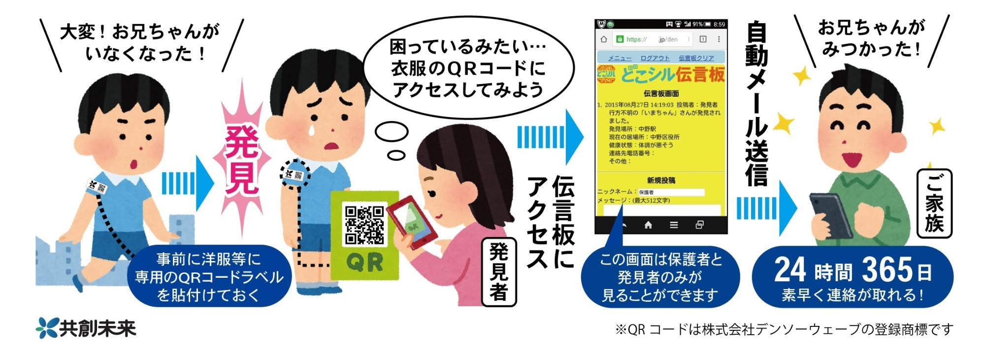 - 道に迷っている等保護が必要な場合には、スマートフォンで衣類等に貼付けされている二次元バーコードを読み取ってください。二次元バーコードの読み取りが困難な場合は、警察に相談してください。