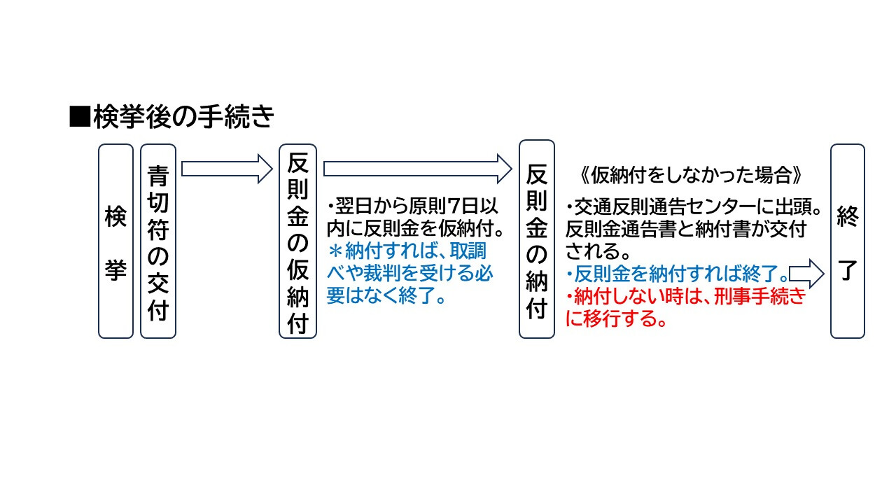 青切符導入後、16歳以上の者が自転車の反則行為で検挙された時は、次の図の通り手続きが進みます。尚、「青切符」制度では、違反者に前科がつくことはありません。ただし、納付書に記載された反則金を納付しなかった場合は、刑事手続きに移行することになります。