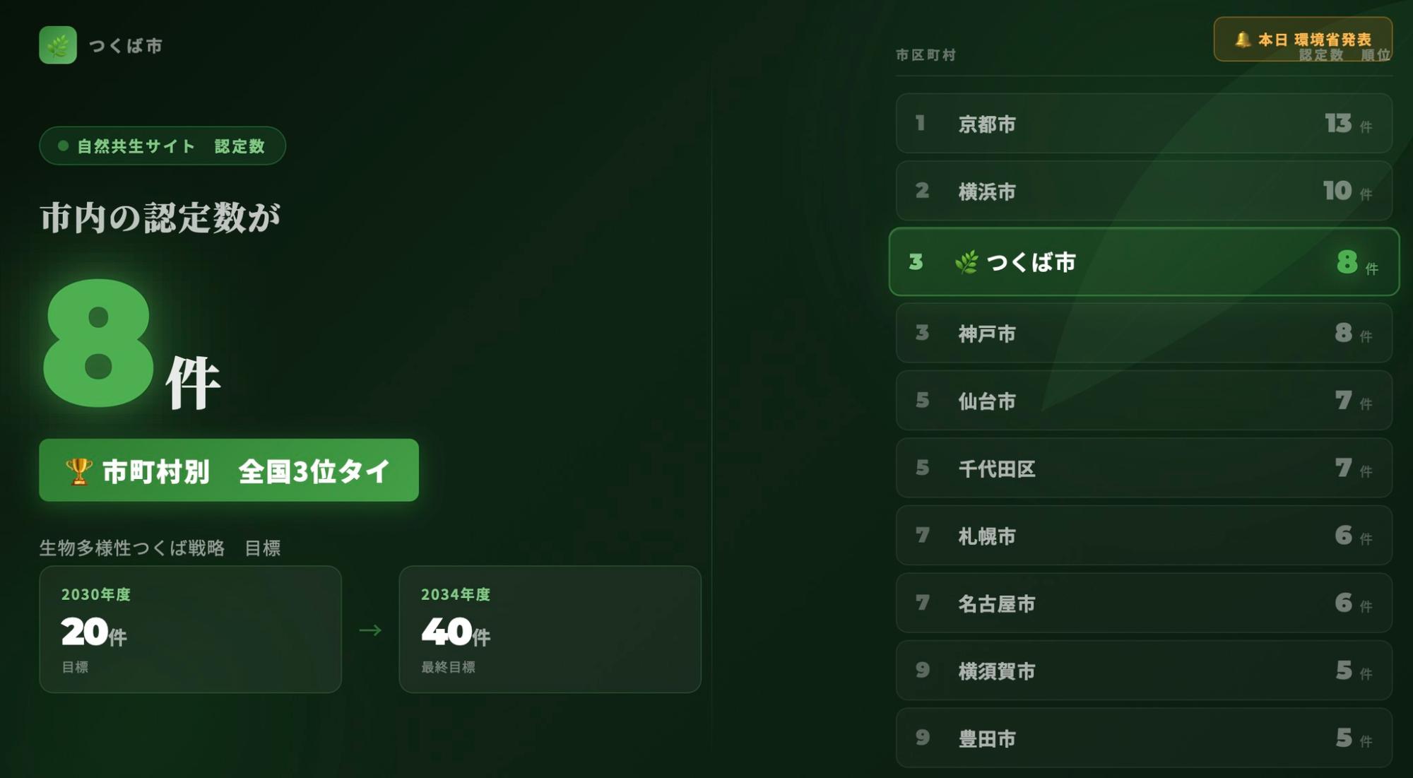 「自然共生サイト」とは、民間の土地や企業の敷地も含めて、生物多様性の保全に貢献していると環境省が認定する制度です。誰かが声をあげて、手を挙げてくれないと増えない。つくばにはそれをやってくれるみなさんが、確実に増えています。