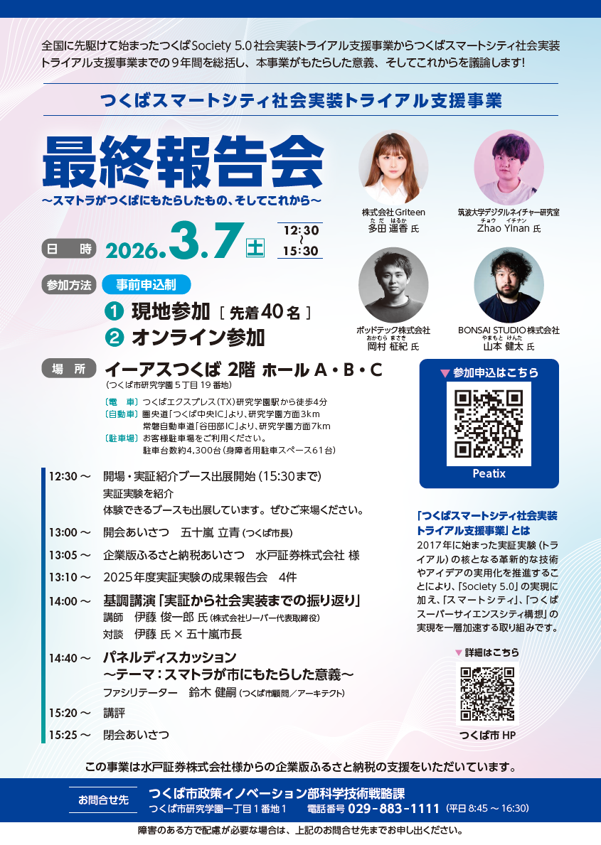 全国に先駆けて始まったつくばSociety 5.0社会実装トライアル支援事業からつくばスマートシティトライアル支援事業までの9年間を総括し、本事業がもたらした意義、そしてこれからを議論します。
