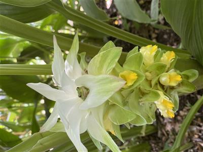 ウコンの花が咲くと毎年写真を撮っていますがこの時はアオガエルがこんにちはしてました。ウコンの花は苞に隠れて奥の方に咲いています。苞に守られている。アオガエルもウコンの苞に守られてそこにいたのです。
