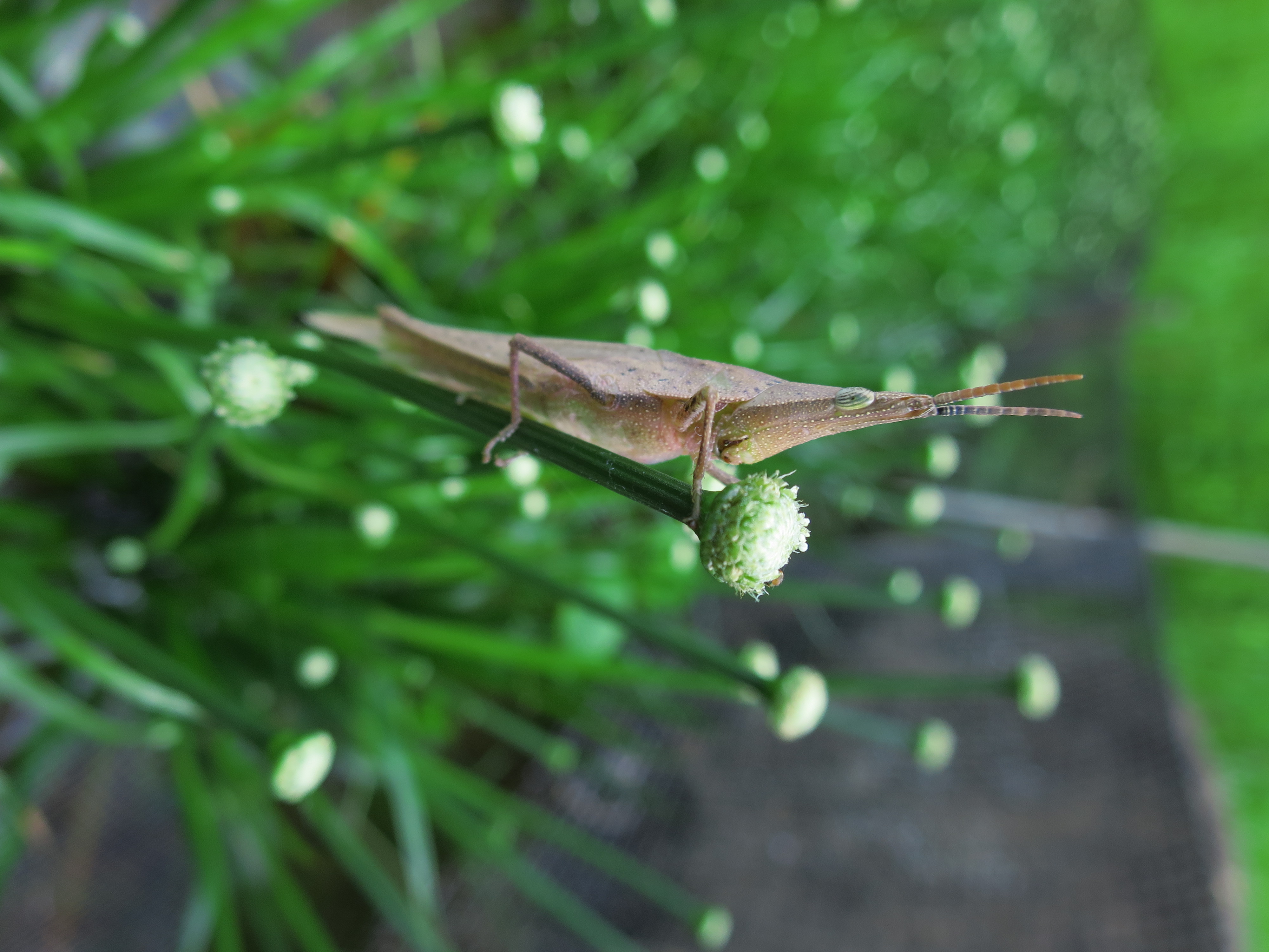 | 2 | 野生から絶滅したコシガヤホシクサ。自生地への野生復帰や保全活動が行われているそうです。小さな蕾と物知り顔のバッタとの組み合わせがユーモラスでした。 | ||