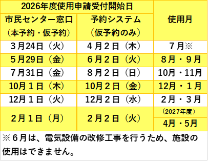 ・市外団体、営利使用団体、音楽室少人数団体の受付開始日は以下の表とは異なり、窓口では使用日の6週間前から、「つくば市公共施設予約システム」(インターネットでの仮予約)ではその翌日からになります。その際の受付開始日が土日祝日の場合は、窓口での受付はその直前の平日が受付開始日となります。