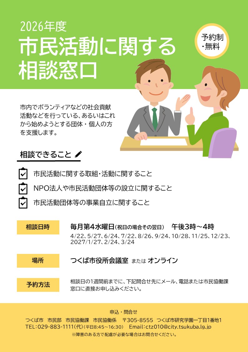市民協働課では市内でボランティアなど社会貢献活動等を行っている、あるいは、これから始めようとする団体・個人の方を支援するため、月1回(外部委託による)相談窓口を開設しています。相談日の1週間前までにメール、電話、または来所によりお申込みください。お申込みの際は、ご希望の相談方法(対面・オンライン)をお知らせください。相談料は無料です。