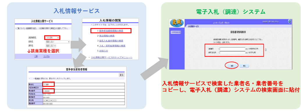 (4)「資格審査情報検索」で①で調べた業者番号、名称をコピー、貼付し検索