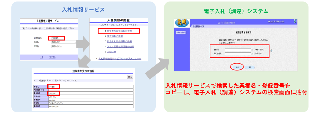 (4)「資格審査情報検索」で①で調べた登録番号、名称をコピー、貼付し検索