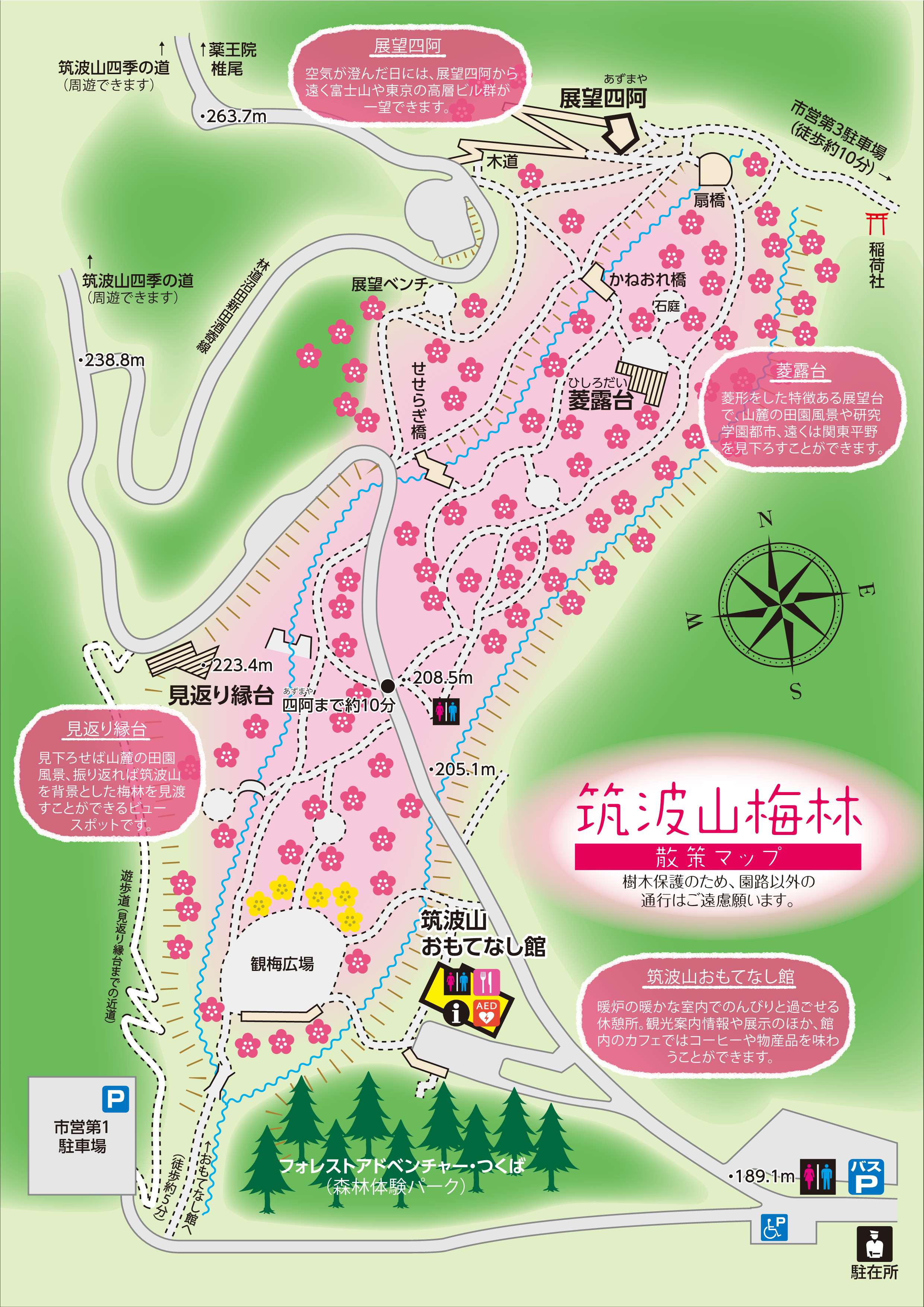 - 筑波山梅林は国定公園にあたります。特別地域内では、植物の採取や野生動物(鳥類、哺乳類に限る)への餌付けをする行為等は法律により制限または禁止されています。